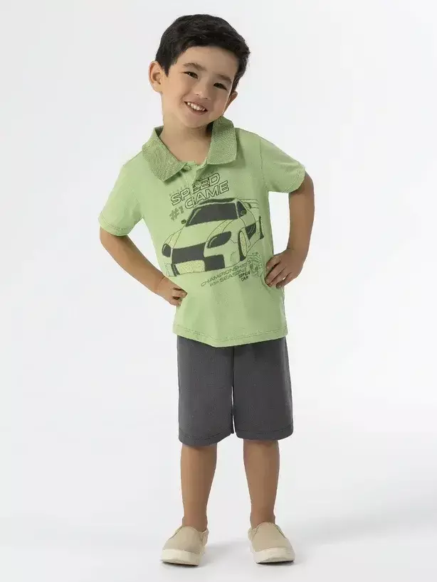 A camiseta polo, confeccionada em malha leve e respirável, traz estampa moderna de carrinho — um toque divertido que as crianças adoram.